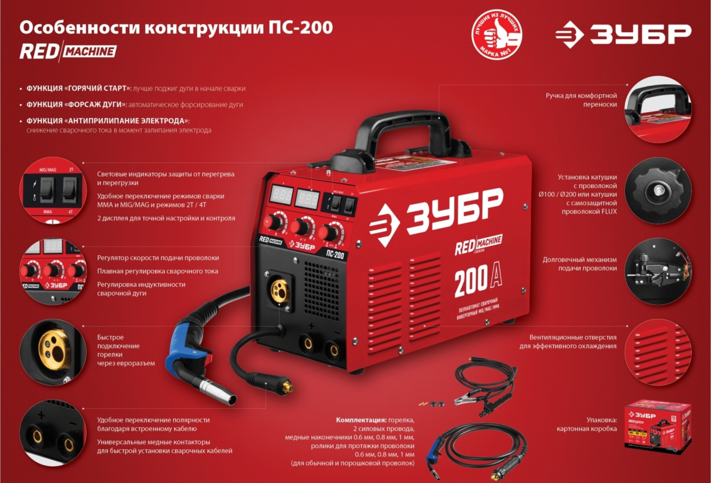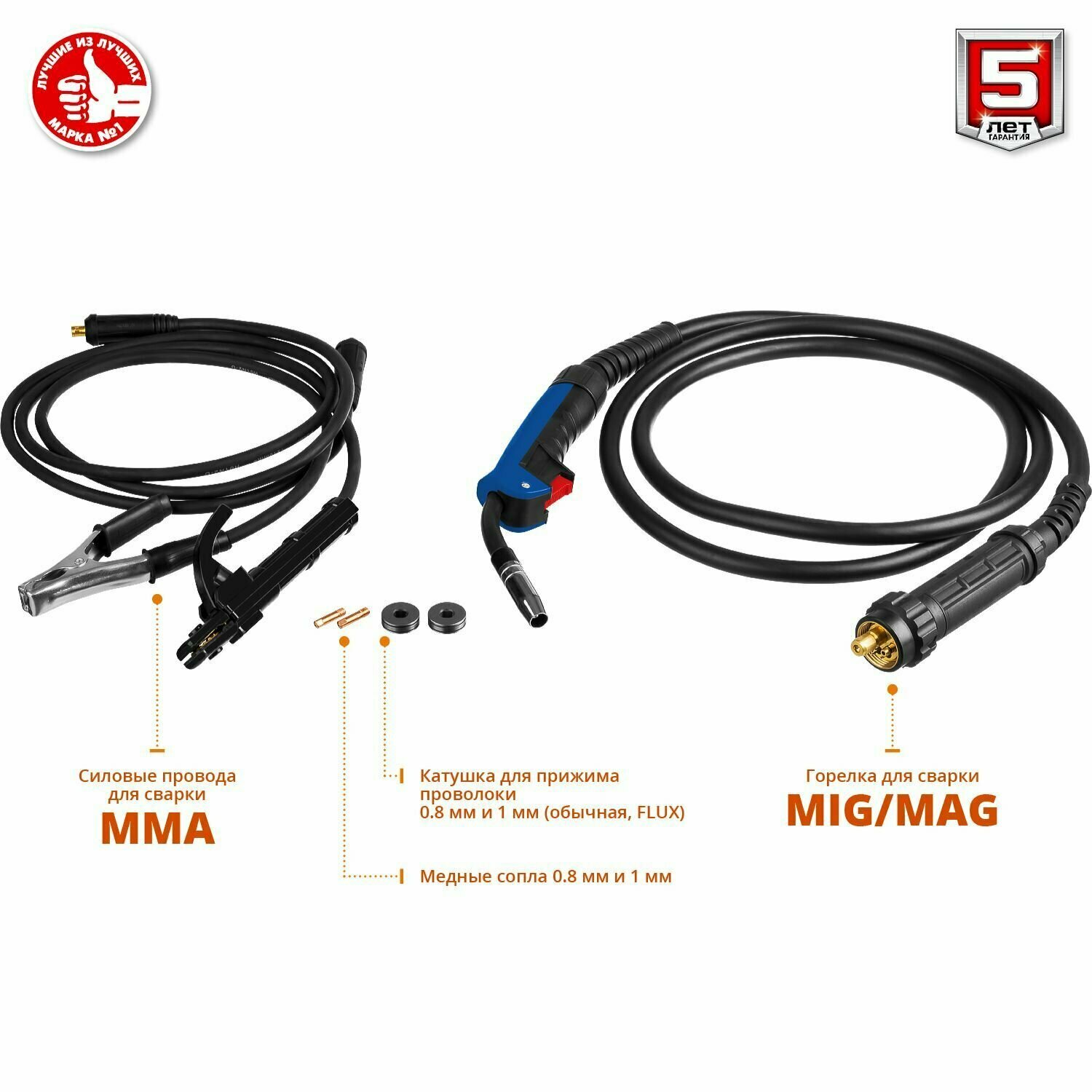 аппарат сварочный 1, горелка MIG/MAG 1, кабель с клеммой заземления 1, комплект сопел 1, руководство по эксплуатации 1