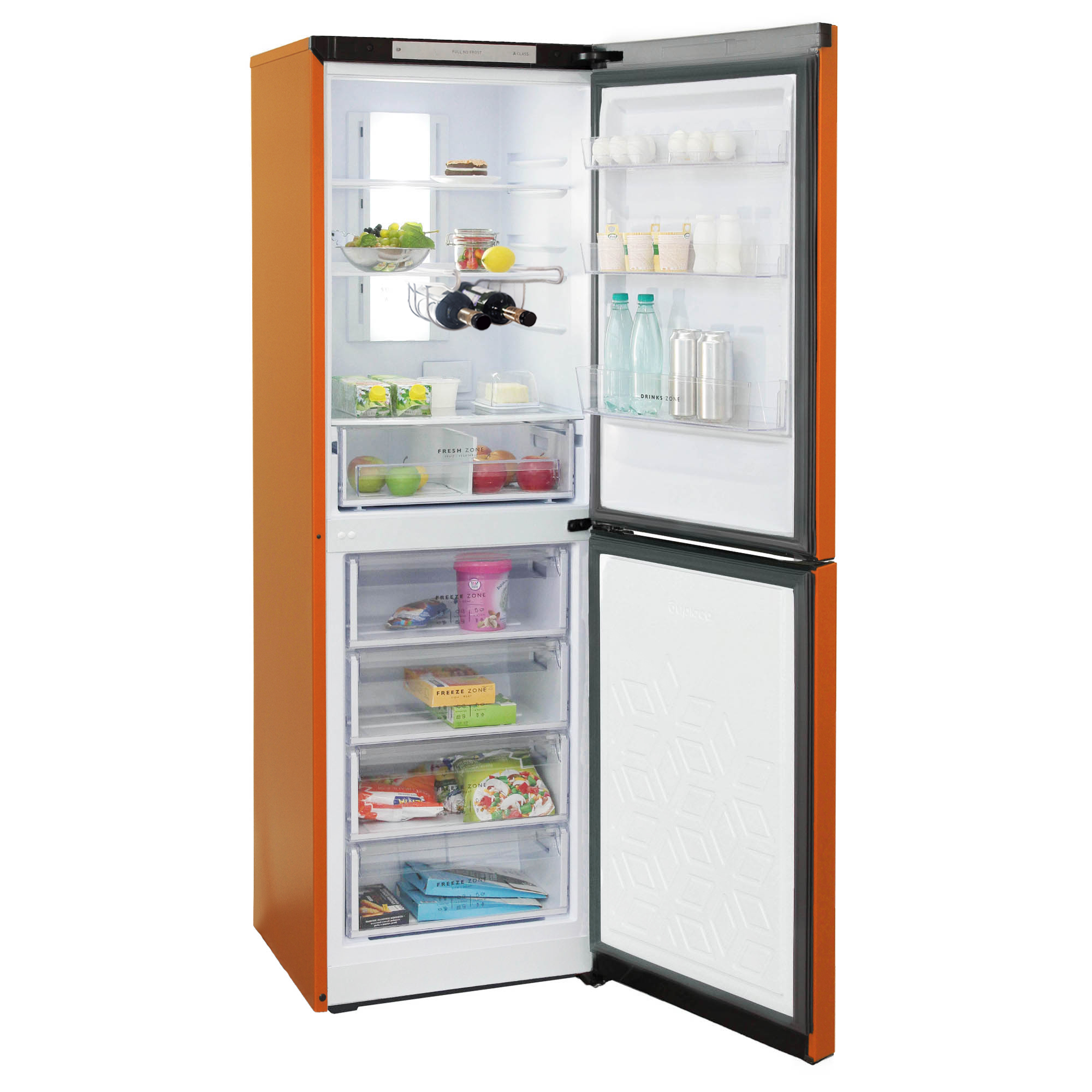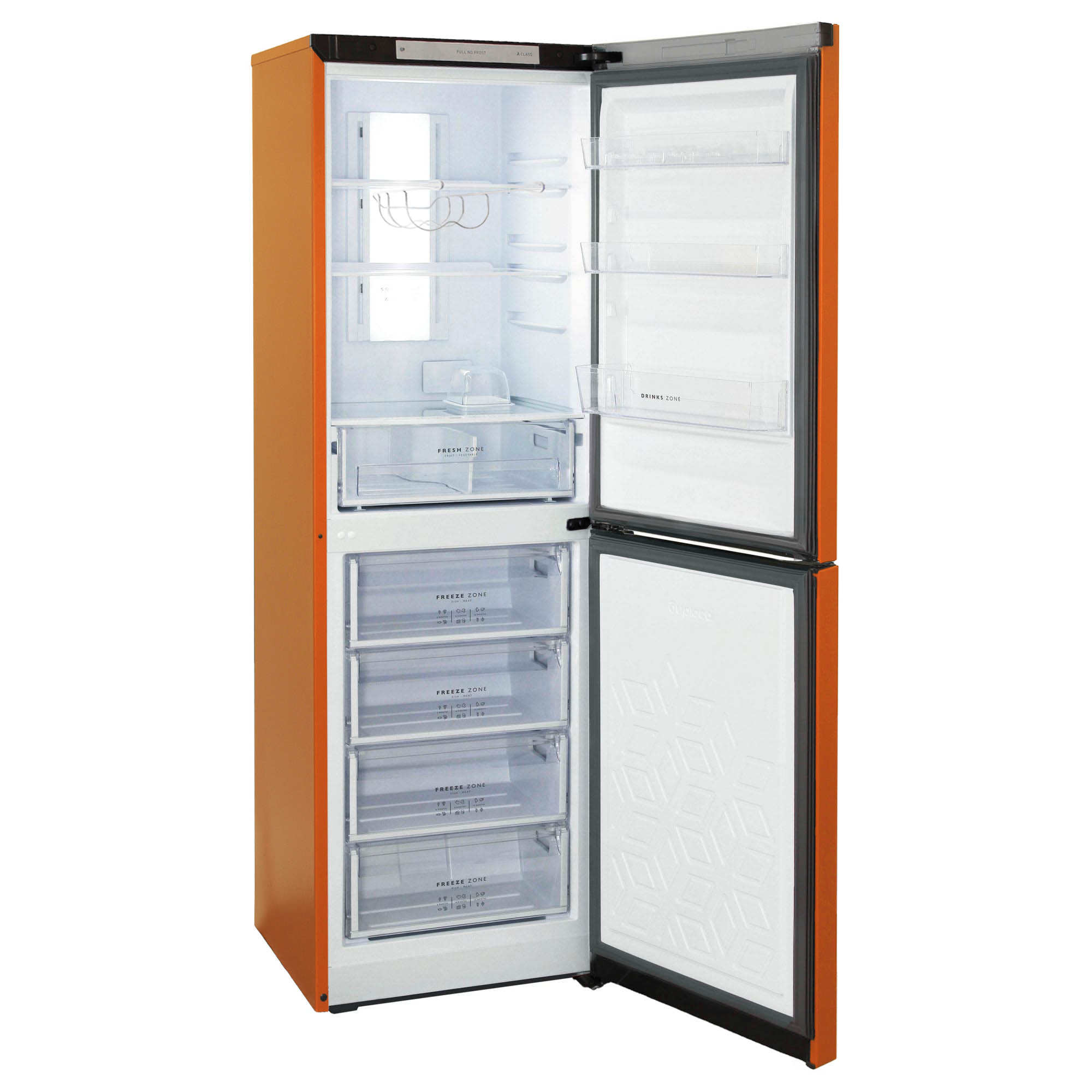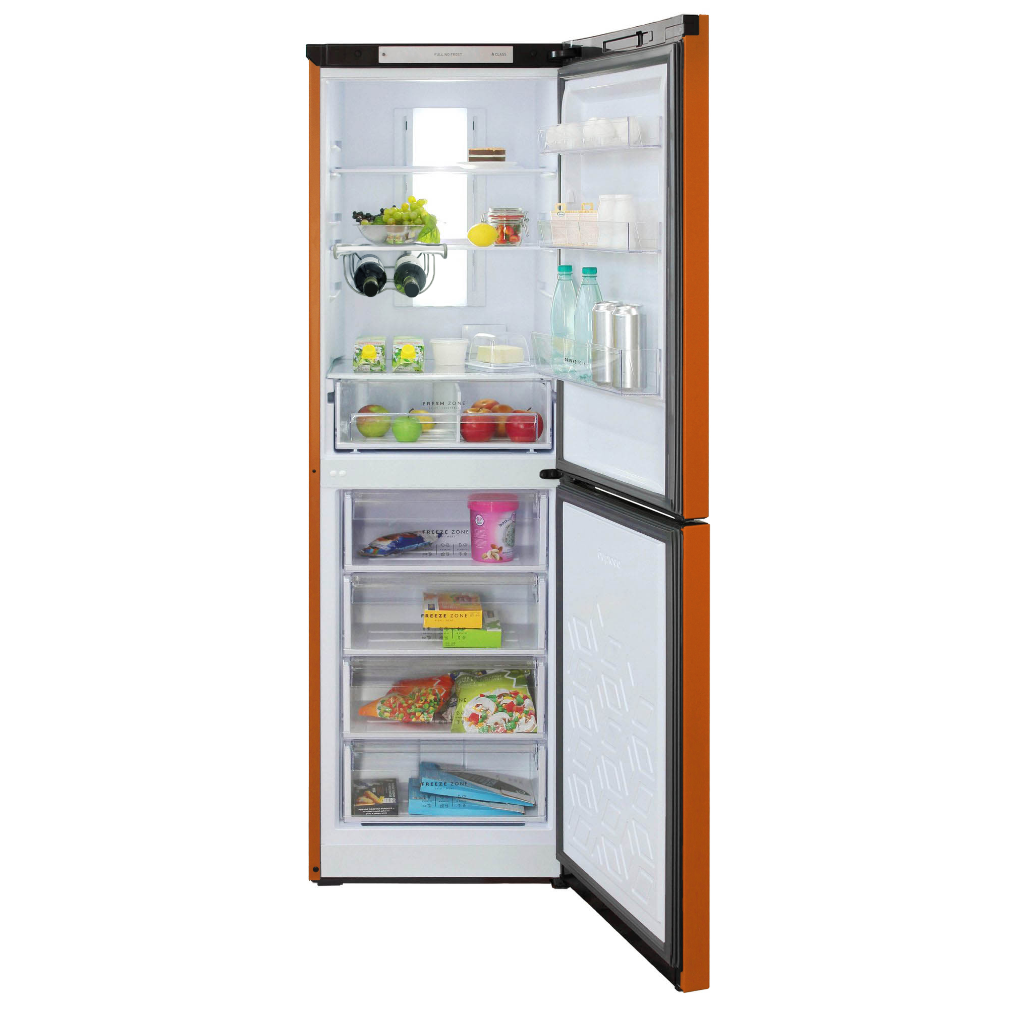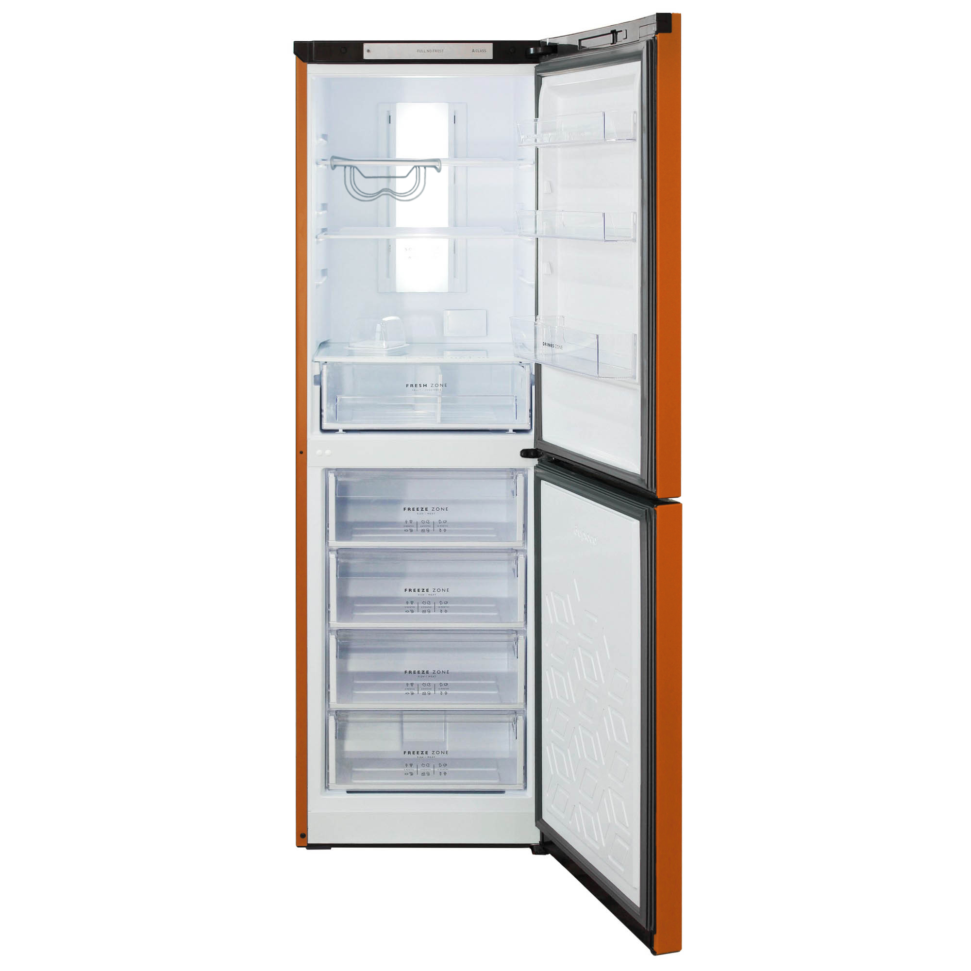 Цвет - оранжевый; Общий объем - 340 л; Объем холодильной камеры - 210 л; Объем морозильной камеры - 130 л; Класс энергоэффективности - A; Количество камер - 2; Количество дверей - 2; Расположение морозильной камеры - Нижнее; Управление - LED дисплей; Количество компрессоров - 1; Климатический класс - N, ST; Уровень шума - 43 дБ; Возможность перевешивания двери - да; Размораживание холодильной каме