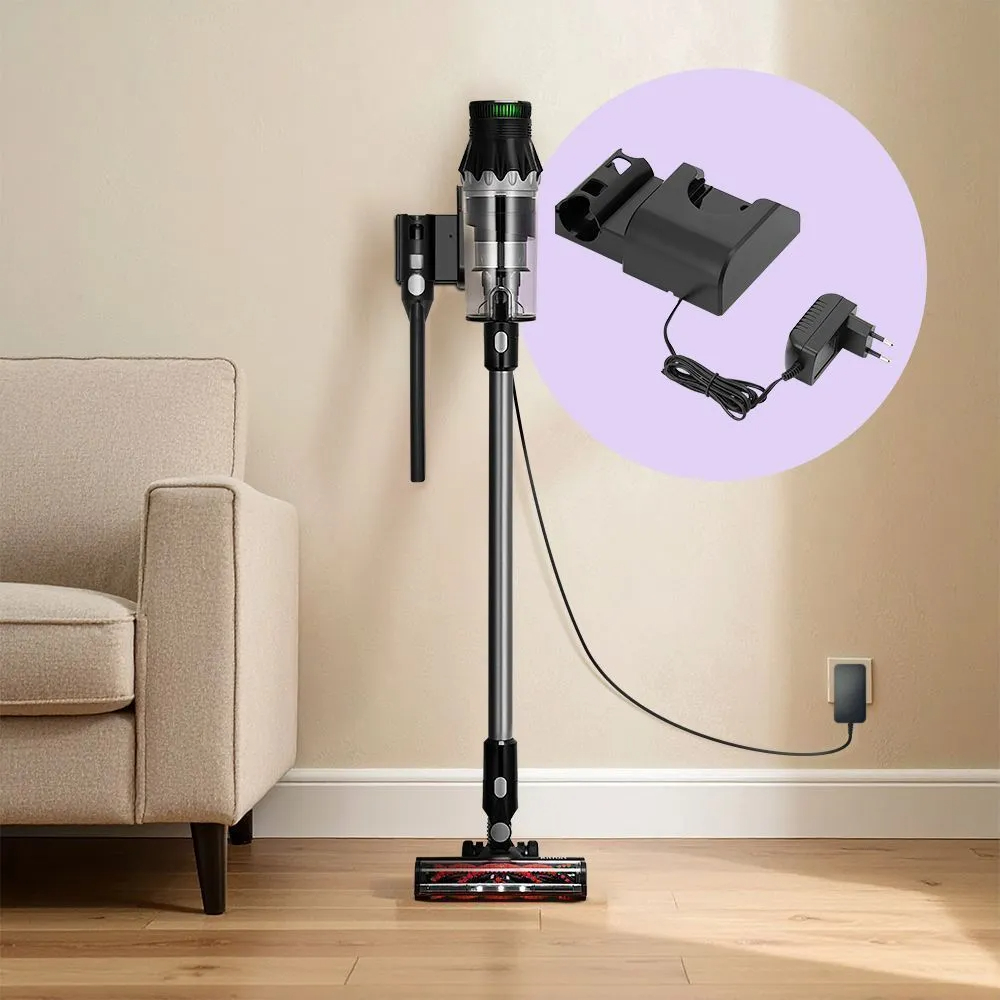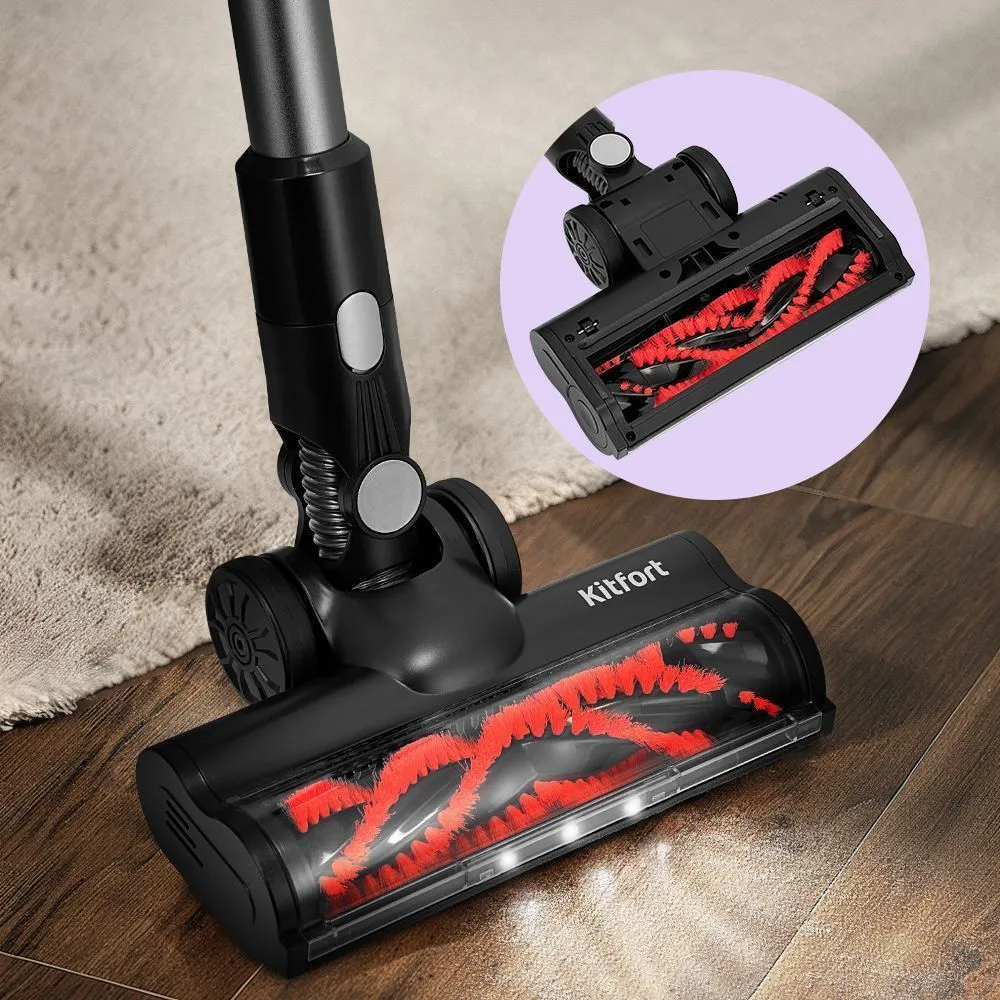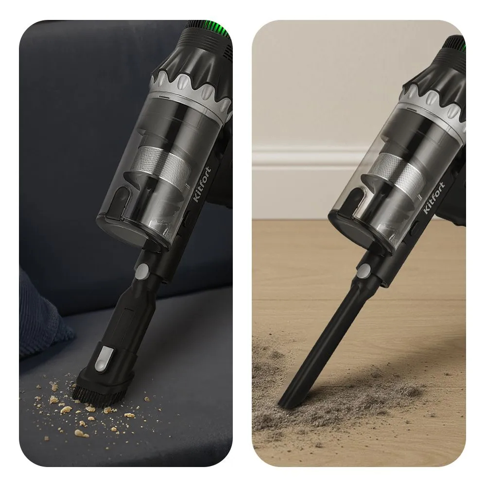Вид пылесборника - Контейнер; Тип уборки - Сухая; Вид насадки пылесоса - Турбощетка,Комбинированная насадка,Щелевая насадка; Вид фильтра - Циклонный; Количество насадок - 3; Количество режимов работы - 4; Вид пылесоса - Беспроводной 2-в-1; Тип трубки - Цельная; Материал трубки - Металл; Длина шнура, м - 1.5; Особенности - Вертикальная парковка,Индикатор заполнения пылесборника,Подсветка зоны уборк