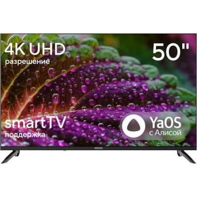 Обязательные программы предустановлены - Да; Диагональ экрана, дюймы - 50″; Разрешение - 3840x2160 4K; Smart TV - Да; Тип подсветки - Direct LED; Беспроводные интерфейсы - Bluetooth,Wi-Fi; Частота обновления - 60 Гц; Операционная система ТВ - YaOS; Число портов HDMI - 3; Стандарт крепления VESA - 200x200 мм; Технология матрицы ТВ - VA; Гарантийный срок - 12 месяцев; Тип - Телевизор; Цвет - Черный;