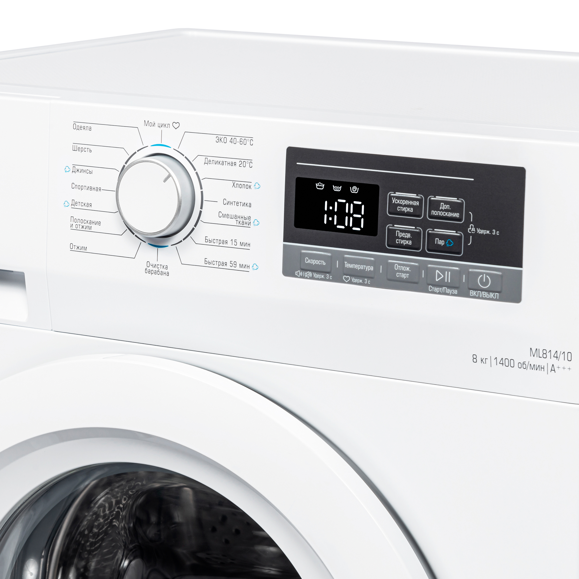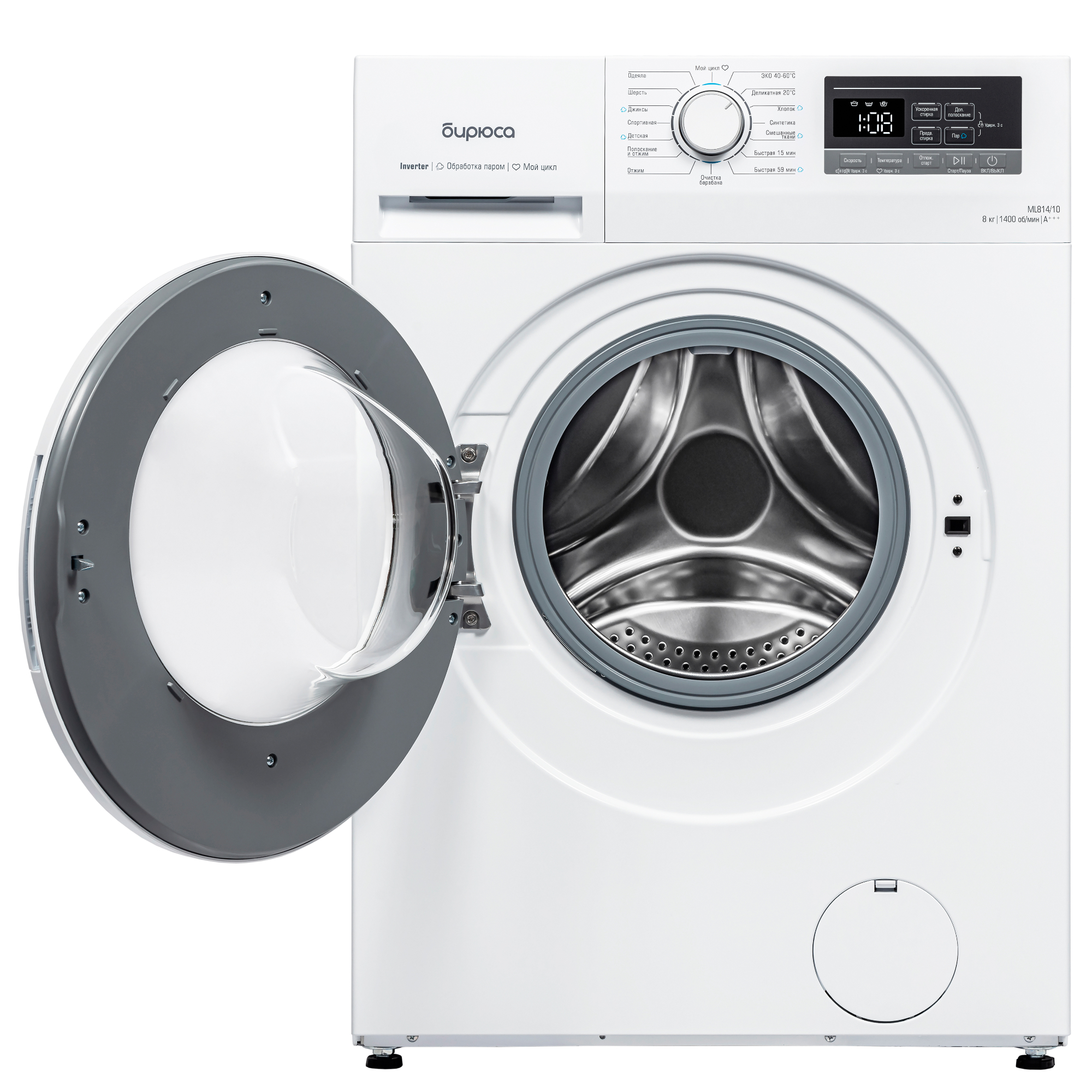Тип загрузки - Фронтальная; Загрузка белья, кг - 8; Максимальная скорость отжима, об./мин. - 1400; Класс энергопотребления - A+++; Размеры, мм (ШхГхВ) - 595х533х850; Наличие сушки - Без сушки; Тип управления - Электронное; Прямой привод - Нет; Расход воды за цикл, л - 48; Инверторный двигатель - Да; Тип - Стиральная машина; Цвет - Белый,прозрачный; Вид стиральной машины - Автоматическая; Уровень ш