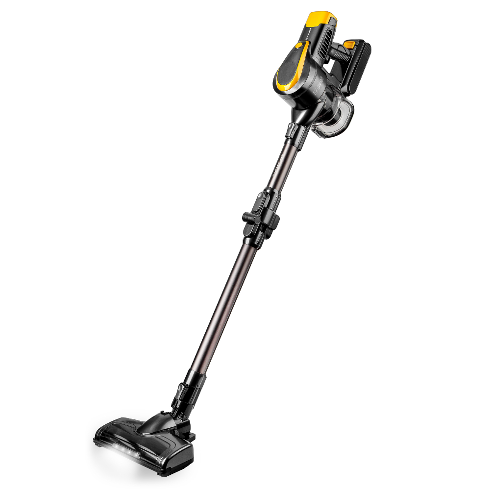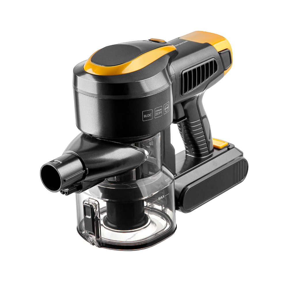 Мощность всасывания, Вт - 350; Вид пылесборника - Контейнер; Тип уборки - Сухая; Время работы от аккумулятора, мин - 60; Вид насадки пылесоса - Для мебели,Для уборки пола,Щелевая насадка; Объем пылесборника, л - 0.8; Вид фильтра - HEPA; Количество насадок - 3; Количество режимов работы - 3; Макс. уровень шума, дБ - 80; Тип - Вертикальный пылесос; Цвет - Серый,желтый; Сила всасывания, Па - 23000; П