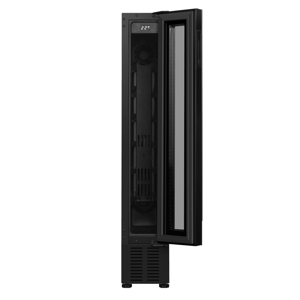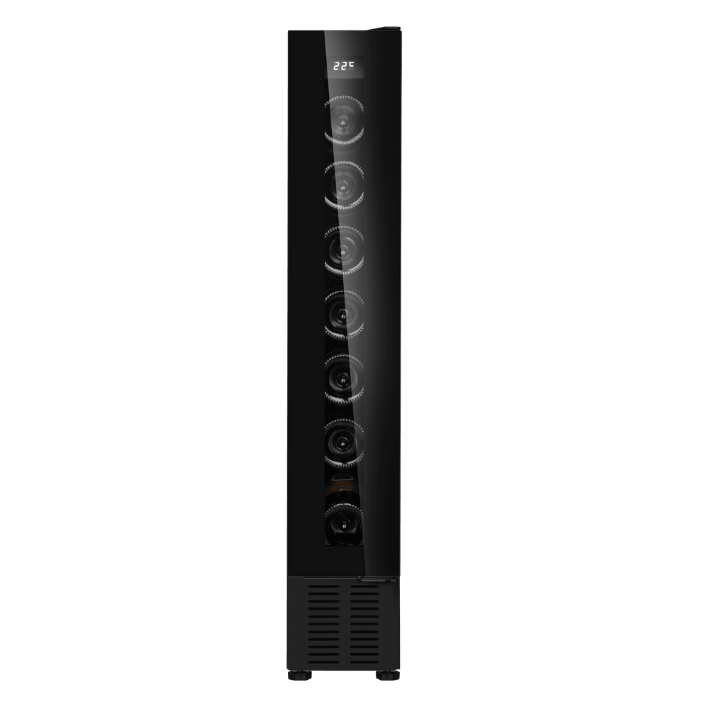 Цвет - Черный; Количество камер - 1; Тип освещения - Светодиодное; Диапазон температуры, °C - 5-20; Макс. кол-во бутылок, шт - 7; Полезный объём, л - 20; Тип установки/монтажа - Встраиваемый; Высота - 870 мм; Глубина - 537 мм; Ширина - 150 мм; Вес - 18,52 кг; Тип охлаждения - Компрессорный; - ;