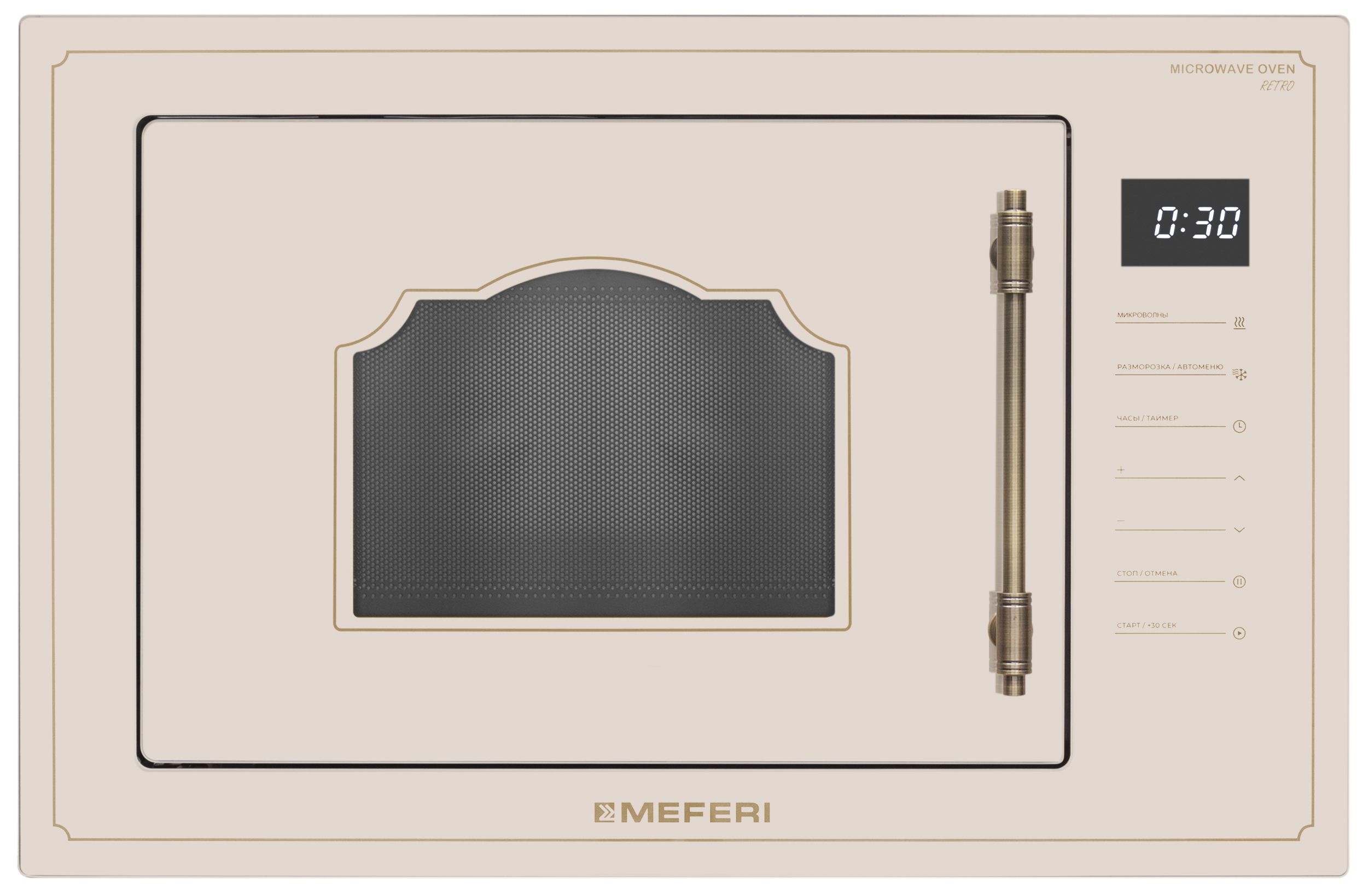 Объем, л - 25; Диаметр поворотного стола, см - 31.5; Макс. мощность СВЧ, Вт - 1450; Управление - Сенсорное; Технология СВЧ - С поворотным столом; Внутреннее покрытие микроволновой печи - Нержавеющая сталь; Открывание дверцы микроволновой печи - Ручка; Направление открывания дверцы - Боковое налево; Тип - Встраиваемая микроволновая печь; Цвет - Бежевый; Программы приготовления - Пицца,Суп,Разморозк