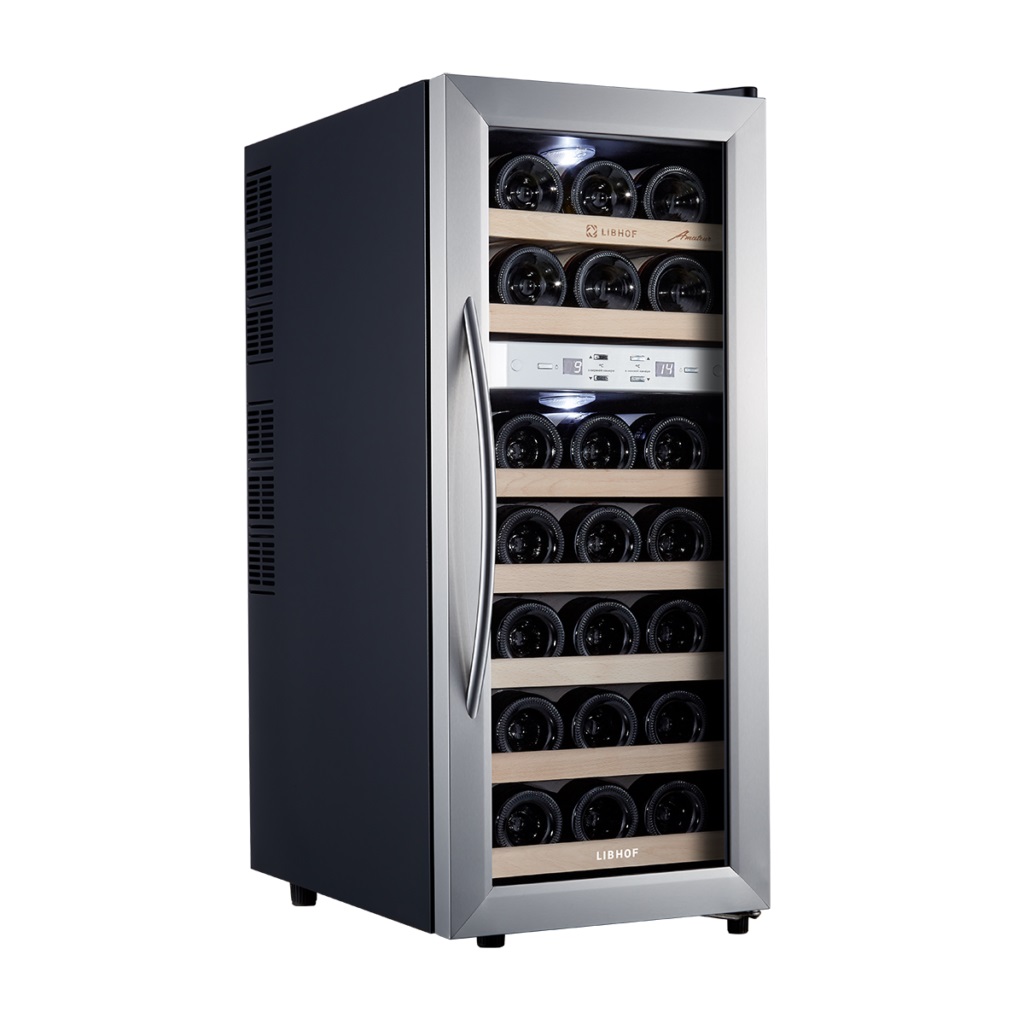Общий объем, л - 60; Количество бутылок, шт - 21; Размеры, мм (ШхГхВ) - 340х510х820; Класс энергопотребления - B; Автономное сохранение холода, ч - 72; Макс. уровень шума, дБ - 41; Количество камер - 2; Климатический класс - SN +10°C / +32°C; Открывание дверей - Перевешиваемые двери; Тип - Винный шкаф; Цвет - Серый металлик; Количество температурных зон - 2; Тип охлаждения - Термоэлектрический; Ос